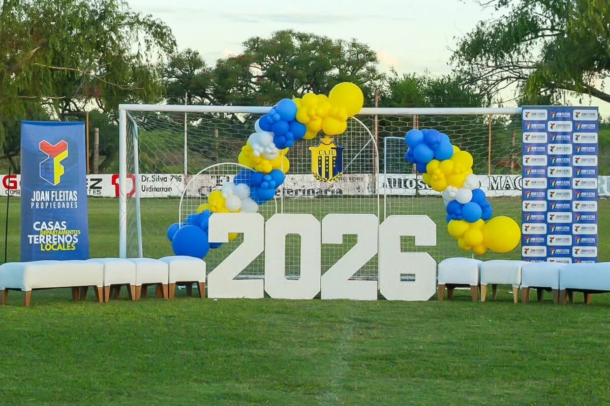 El sector contó con banners institucionales de Joan Fleitas Propiedades, una ambientación con globos azules y amarillos —los colores característicos del club—, un imponente “2026” gigante que simbolizó el comienzo de la nueva temporada, cómodos sillones dispuestos para la presentación y el arco de la cancha como fondo del escenario, generando un marco muy especial para el lanzamiento.